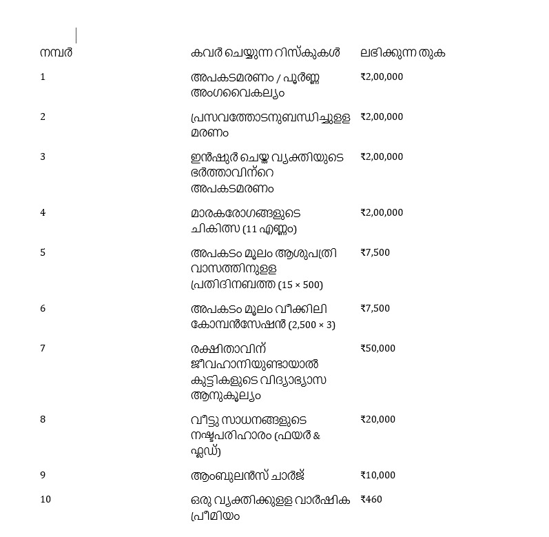 ഇണങ്ങുന്ന ഈ പോളിസിയില് വര്ഷത്തില് 460 രൂപ പ്രീമിയം അടച്ചാല് 9 വിവിധങ്ങളായ റിസ്കുകളാണ്കവര് ചെയ്യുന്നത്.