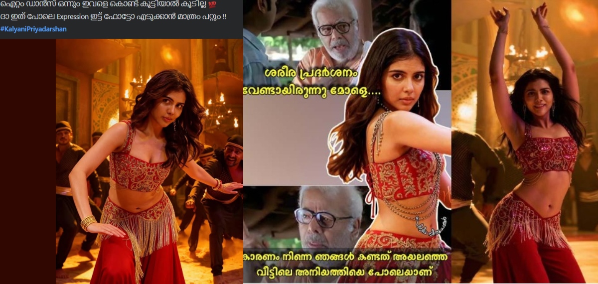 'ശരീര പ്രദർശനം വേണ്ടായിരുന്നു മോളെ, നിന്നെ കണ്ടത് അനിയത്തിയെ പോലെ', ‘എന്തിനിത് ചെയ്തു’, ‘സായ് പല്ലവിയെ പോലെ കാരക്ടർ റോളുകളിൽ ശ്രദ്ധ കേന്ദ്രീകരിക്കൂ, ദയവായി ഇത്തരം ഫാൻസി കാര്യങ്ങളിൽ വീഴരുത്’, തുടങ്ങി ഗാനം പുറത്തിറങ്ങിയതിന് പിന്നാലെ സോഷ്യൽ മീഡിയയിൽ പോസ്റ്റുകൾ കുമിഞ്ഞു കൂടുകയാണ്. ഐറ്റം ഡാൻസ് ഒന്നും കല്യാണിയെ കൊണ്ട് കൂട്ടിയാൽ കൂടില്ല എന്നും നിരവധി പേരാണ് കമ്മന്റ് ചെയ്തിരിക്കുന്നത്. എന്നാൽ 2025 ലും നായികമാരെ ഒബ്ജിറ്റിഫൈ ചെയ്യുന്ന ഇത്തരം പാട്ടുകൾ നിർത്താറായില്ലെയെന്നും ചിലർ ചോദിക്കുന്നുണ്ട്.