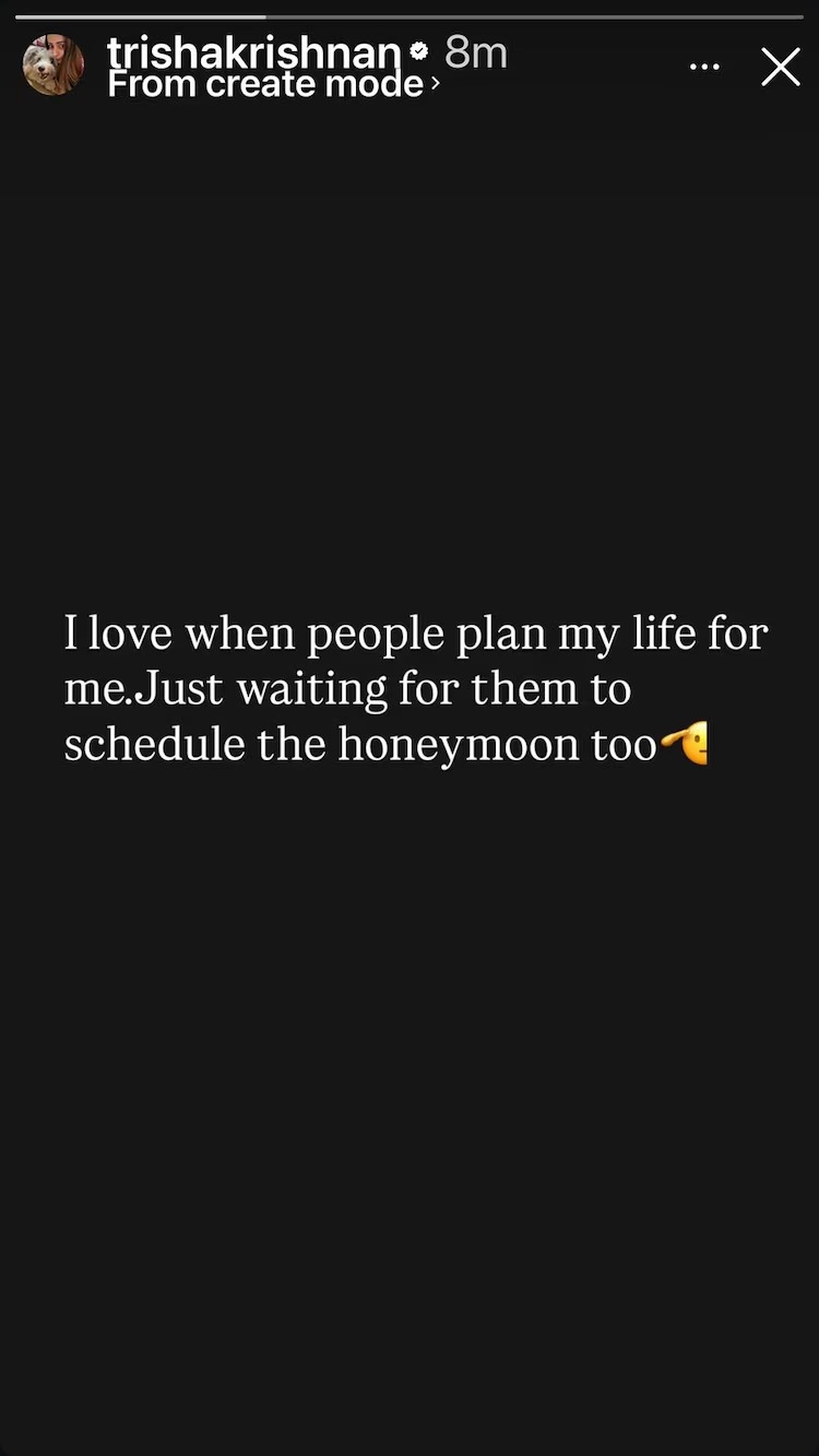 ഇന്ന് സോഷ്യൽ മീഡിയയിൽ നിറഞ്ഞു നിന്ന വാർത്ത ആയിരുന്നു നടി തൃഷയുടെ വിവാഹം. ഛണ്ഡീഗഢുകാരനായ വ്യവസായുമായി നടിയുടെ വിവാഹം തീരുമാനിച്ചതായി റിപ്പോർട്ടുകൾ നിറഞ്ഞിരുന്നു. ഇരു കുടുംബങ്ങളും തമ്മിൽ നേരത്തെ സൗഹൃദത്തിൽ ആണെന്നും വിവാഹത്തിന് ഒരുങ്ങുന്നുവെന്നുമാണ് റിപ്പോർട്ടുകൾ പ്രചരിച്ചിരുന്നത്. ഇപ്പോഴിതാ ഈ അഭ്യൂഹങ്ങളിൽ പ്രതികരിച്ചെത്തിയിരിക്കുകയാണ് നടി. എന്നാൽ പിന്നെ എന്റെ ഹണിമൂണും നിങ്ങൾ പ്ലാൻ ചെയ്യൂ എന്നാണ് സോഷ്യൽ മീഡിയയിൽ സ്റ്റോറി പങ്കിട്ടുകൊണ്ട് നടി കുറിച്ചിരിക്കുന്നത്.