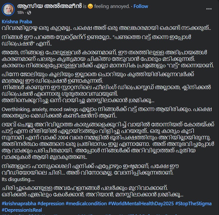 Content Highlights: Krishnaprabha's controversial remark on depression is a topic of discussion