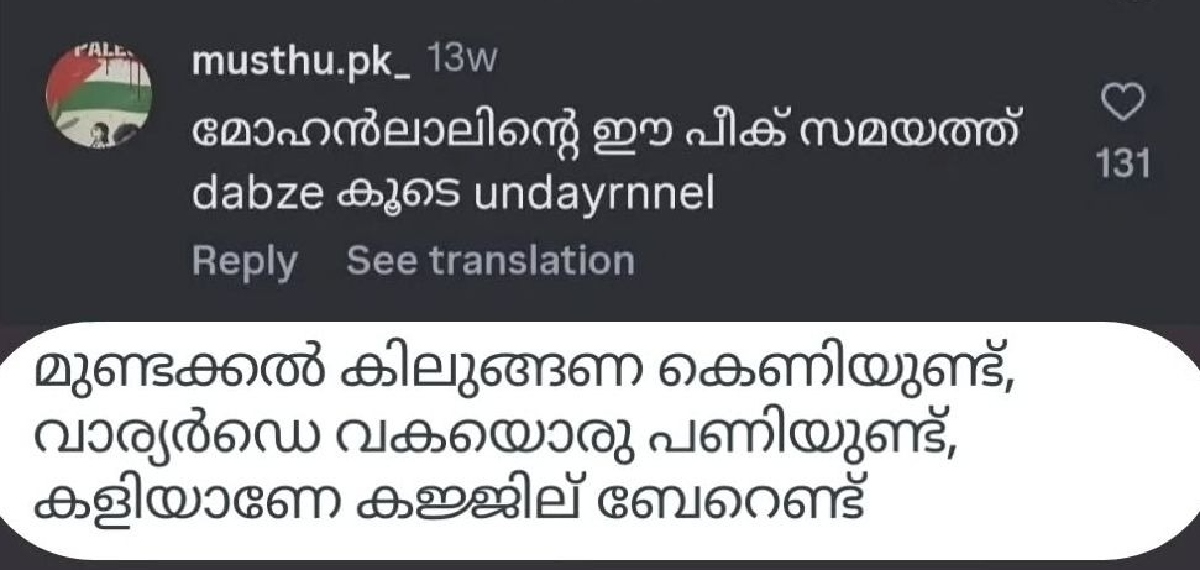 'മുണ്ടക്കൽ കിലുങ്ങണ കെണിയുണ്ട്..വാര്യർഡെ വകയൊരു പണിയുണ്ട്. കളിയാണേ കജ്ജില് ബേറേണ്ട്', എന്നാണ് മറുപടിയായി നൽകിയിരിക്കുന്ന കമന്റ്. ദേവാസുരവും രാവണപ്രഭവും ആവേശത്തിൽ നിൽക്കുന്ന ആരാധകർ ഈ തമാശ കമന്റും ഏറ്റെടുത്തിരിക്കുകയാണ്.