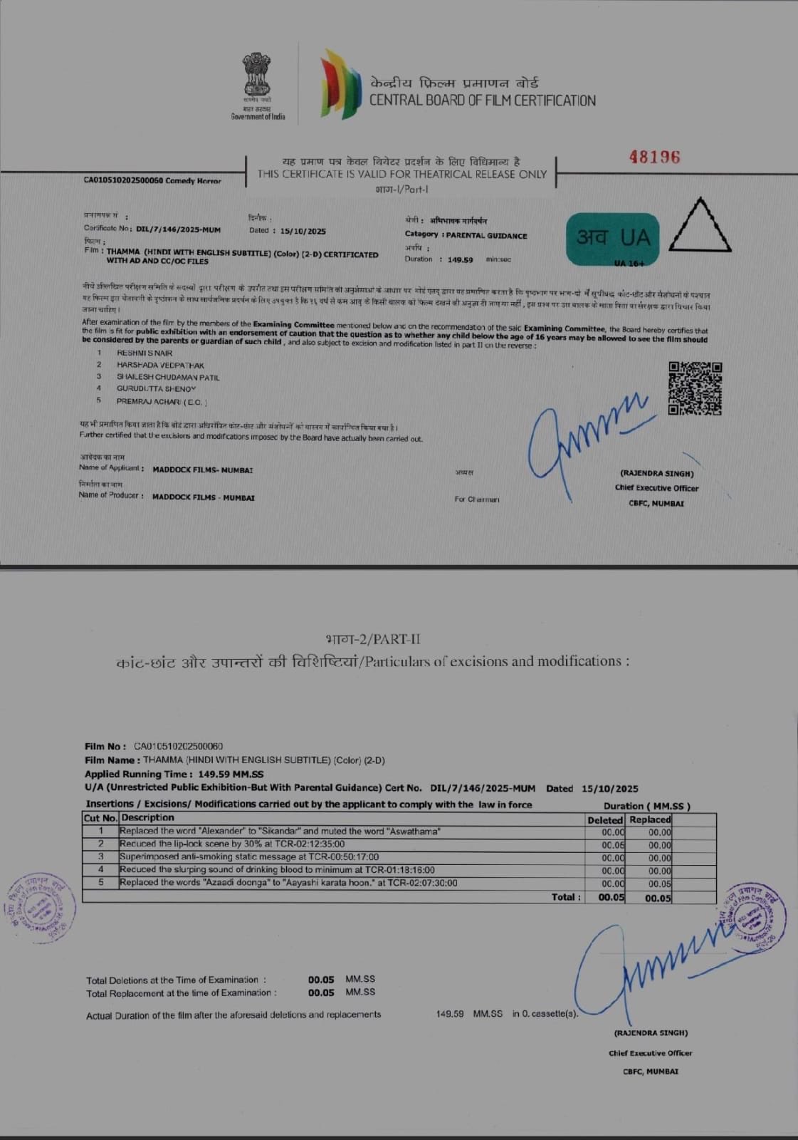 മഡോക്ക് ഹൊറർ കോമഡി യൂണിവേഴ്സിലെ അഞ്ചാമത്തെ ചിത്രമാണ് ഥാമ. ആയുഷ്മാൻ ഖുറാന, രശ്മിക മന്ദാന എന്നിവരാണ് സിനിമയിലെ പ്രധാന കഥാപാത്രങ്ങൾ. ചിത്രം ദീപാവലി റിലീസായി ഒക്ടോബർ 21 ന് തിയേറ്ററിലെത്തും. സിനിമയുടെ സെൻസർ സർട്ടിഫിക്കറ്റ് ഇപ്പോൾ പുറത്തുവന്നിട്ടുണ്ട്. ഇപ്പോഴിതാ സെൻസർ സർട്ടിഫിക്കറ്റിലെ വിവരങ്ങളാണ് സോഷ്യൽ മീഡിയയിൽ ചർച്ചയാകുന്നത്.