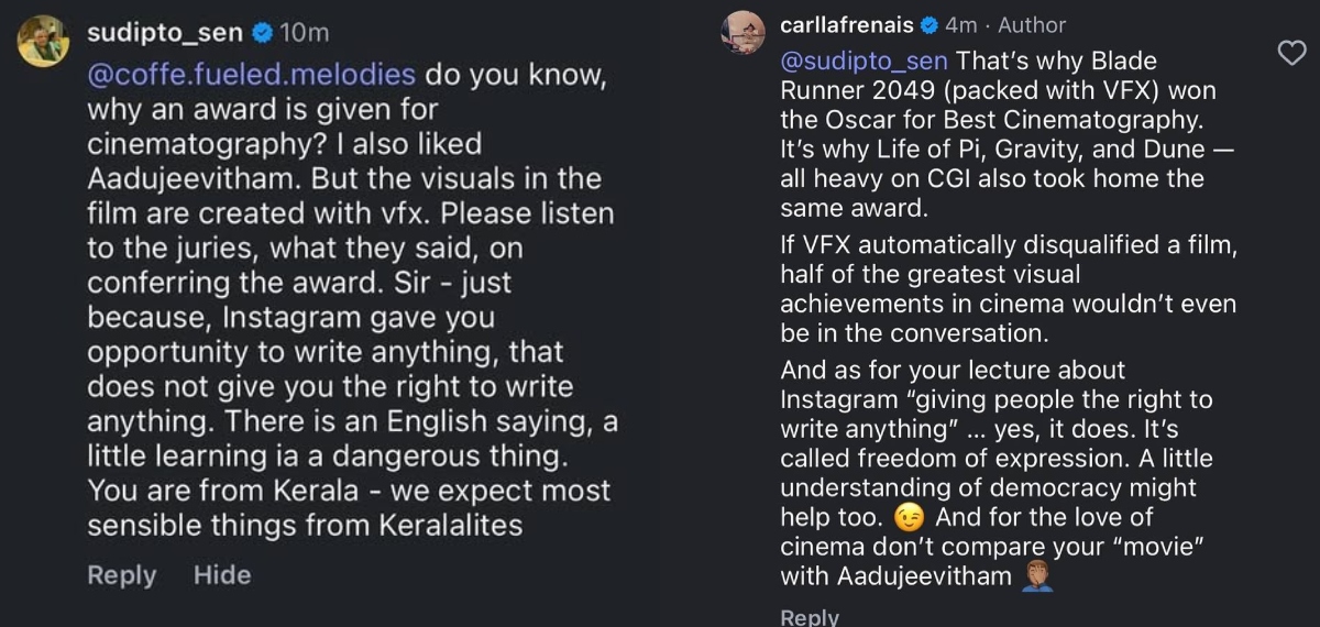 'അങ്ങനെയെങ്കിൽ ലൈഫ് ഓഫ് പൈ, ബ്ലേഡ് റണ്ണർ 2049, ഡൂൺ, ഗ്രാവിറ്റി എന്നീ ചിത്രങ്ങൾക്ക് മികച്ച ഛായാഗ്രഹണത്തിനുള്ള ഓസ്കർ ലഭിച്ചില്ലേ?, VFX എന്ന ഘടകം ഒരു സിനിമയെ പുരസ്കാരത്തിനുള്ള അർഹതയ്ക്ക് അയോഗ്യമാക്കുമെങ്കിൽ, സിനിമാ ലോകത്തെ പകുതി കാര്യങ്ങൾ സംസാര വിഷയം പോലുമാകില്ലായിരുന്നു. പിന്നെ ഇൻസ്റ്റാഗ്രാമിൽ എഴുതുന്നതിനെക്കുറിച്ച് നിങ്ങൾ ക്ലാസ്സെടുത്തത് കൊണ്ട് പറയട്ടെ, എന്തും എഴുതാനുള്ള അവകാശം, 'ആവിഷ്ക്കാരസ്വാതന്ത്ര്യമാണ്'. ഭരണഘടനയെക്കുറിച്ച് ചെറിയൊരു ധാരണയെങ്കിലും ഉള്ളത് നല്ലതാണ്. പിന്നെ സിനിമയോടുള്ള ഇഷ്ടം കൊണ്ട് പറയുവാണ് നിങ്ങളുടെ ചിത്രത്തെ ആടുജീവിതവുമായി താരതമ്യം ചെയ്യരുത്', കാൾ ലഫ്രനെയ്സ് കുറിച്ചു.