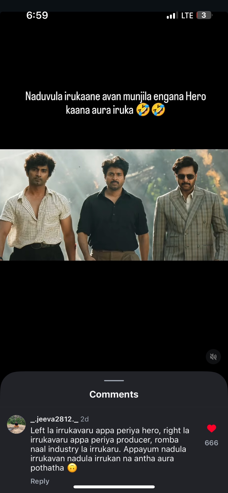 ശിവകാർത്തികേയന്റെ ഏറ്റവും പുതിയ സിനിമയാണ് പരാശക്തി. സുധ കൊങ്കര ഒരുക്കുന്ന സിനിമയിൽ രവി മോഹനും അഥർവയും പ്രധാന വേഷങ്ങളിൽ എത്തുന്നുണ്ട്. ചിത്രത്തിന്റെ ഷൂട്ടിങ്ങ് പൂർത്തിയായി എന്ന ഒരു അപ്ഡേറ്റ് കഴിഞ്ഞ ദിവസം പുറത്തുവന്നിരുന്നു. ഒരു വീഡിയോയും ഇതിനൊപ്പം പുറത്തുവന്നിരുന്നു. മൂവരും സ്ലോ മോഷനിൽ നടന്നുവരുന്നതായിരുന്നു വീഡിയോയുടെ ഉള്ളടക്കം. ഈ വീഡിയോയെ മുൻനിർത്തിയാണ് ശിവകാർത്തികേയനെ കളിയാക്കുന്ന കമന്റുമായി ഒരാൾ എത്തിയത്. 'നടുവിൽ നിൽക്കുന്ന ശിവകാർത്തികേയന്റെ മുഖത്ത് ഒരു ഹീറോയുടെ ഓറ ഒന്നും കാണുന്നില്ല' എന്നായിരുന്നു കമന്റ്. എന്നാൽ ഇതിന് മറ്റൊരു പ്രേക്ഷകൻ നൽകിയ മറുപടിയാണ് ചർച്ചയാകുന്നത്.