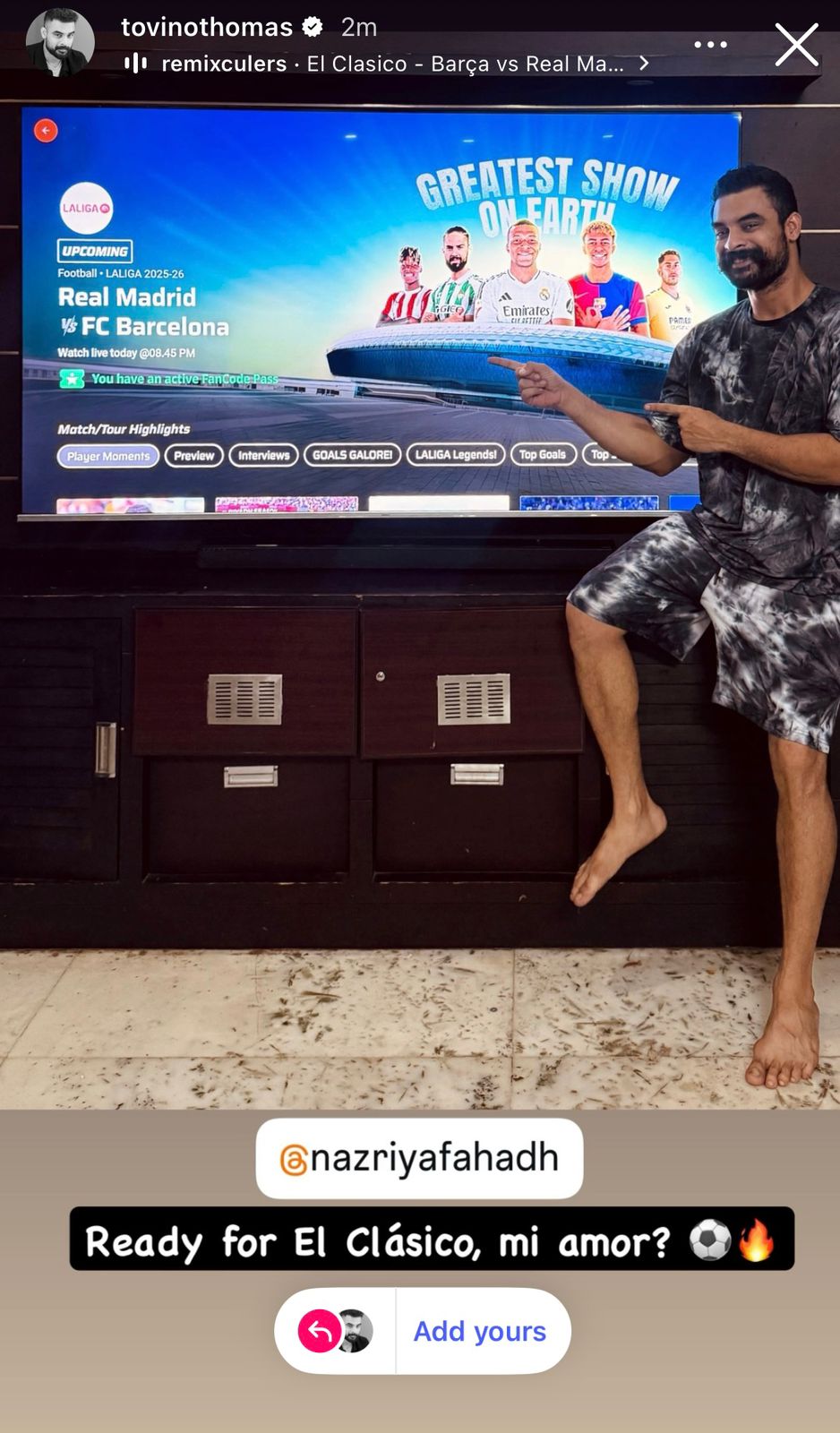 ചിരവൈരികൾ നേർക്കുനേർ എത്തുന്ന എല് ക്ലാസിക്കോ പോരാട്ടത്തിന് മുന്നേ ഇൻസ്റ്റ സ്റ്റോറിയുമായി ടൊവിനോ തോമസ്. "എൽ ക്ലാസിക്കോയ്ക്ക് തയ്യാറാണോ? മി, അമോർ'' എന്ന ചോദ്യവുമായി നസ്രിയയെ ടാഗ് ചെയ്താണ് ടൊവി സ്റ്റോറി പങ്കുവെച്ചിരിക്കുന്നത്. 'എപ്പളേ റെഡി പുയ്യാപ്ലേ' എന്നാണ് ഇതിന് നസ്രിയയുടെ മറുപടി.