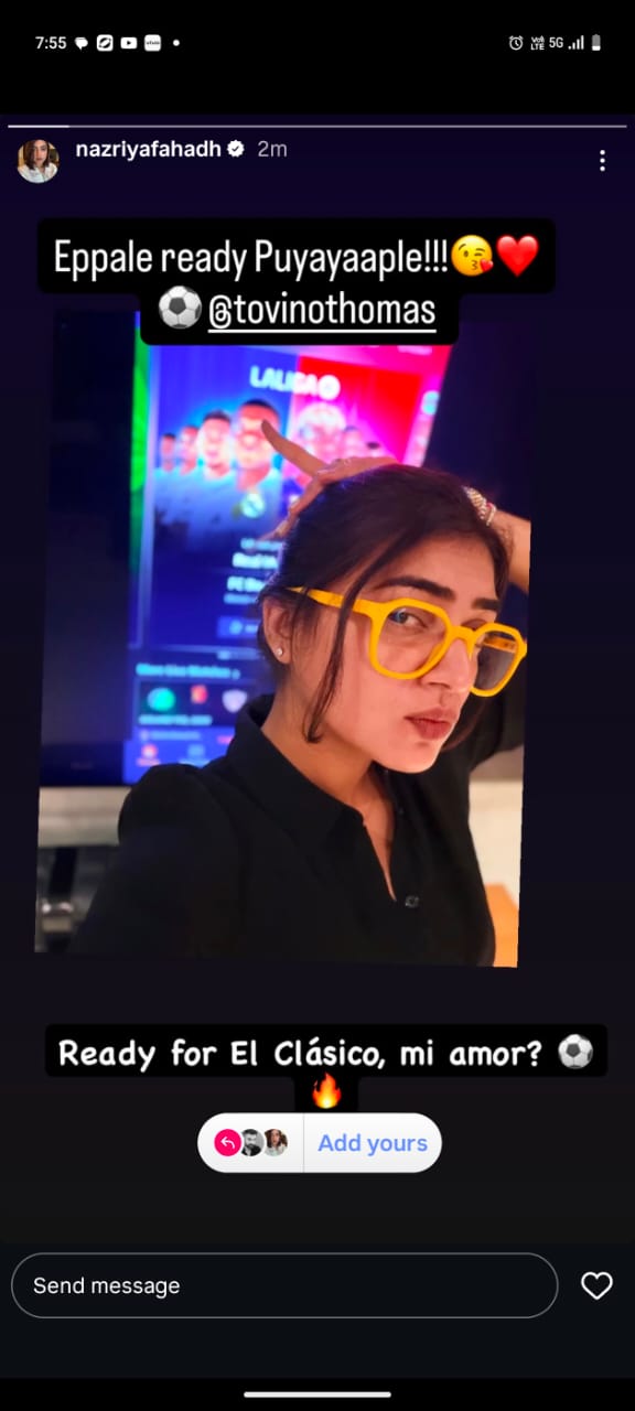 ലാ ലിഗയില് റയല് മാഡ്രിഡ് ഇന്ന് ബാഴ്സലോണയ്ക്കെതിരെ പോരാട്ടത്തിന് ഇറങ്ങുമ്പോൾ ഇൻസ്റ്റയിൽ ടൊവി - നസ്രിയ എൽ ക്ലാസിക്കോ പോരാട്ടം എന്തിനാകുമെന്ന സംശയത്തിലാണ് പ്രേക്ഷകർ. ഇവർ ഒരുമിക്കുന്ന സിനിമ വരാൻ ഒരുങ്ങുകയാണോ, അതോ മറ്റെന്തെങ്കിലുമാണോ എന്നാണ് ഇതോടെ അഭ്യൂഹം സോഷ്യൽ മീഡിയയിൽ പരന്നിരിക്കുന്നത്. ഏതായാലും ടൊവിയുടെയും നസ്രിയയുടേയും സ്റ്റോറി കണ്ട് സംതിങ്ങ് ഫിഷി! എന്നാണ് പലരും പറയുന്നത്.