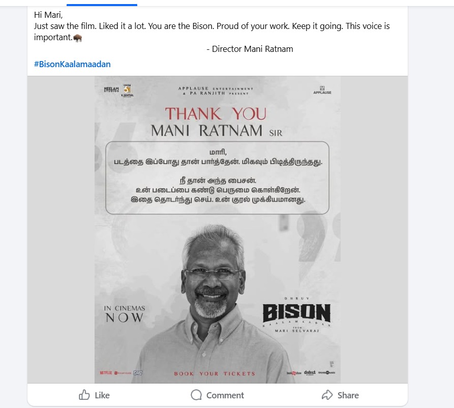 ധ്രുവ് വിക്രമിനെ നായകനാക്കി മാരി സെൽവരാജ് ഒരുക്കിയ സ്പോർട്സ് ഡ്രാമ ചിത്രമാണ് ബൈസൺ. മികച്ച പ്രതികരണം നേടുന്ന സിനിമ ബോക്സ് ഓഫീസിലും മികച്ച പ്രകടനമാണ് കാഴ്ചവെക്കുന്നത്. ഇപ്പോഴിതാ സിനിമ കണ്ടതിന് ശേഷം മരിസെൽവ രാജിനെ അഭിനന്ദിച്ചിരിക്കുകയാണ് മണി രത്നം. സിനിമ ഒരുപാട് ഇഷ്ടമായെന്നും മാരി സെൽവരാജ് ആണ് ബൈസൺ എന്നും മണി രത്നം പറഞ്ഞു. മാരി സെല്വരാജിൽ അഭിമാനിക്കുന്നുവെന്നും ഇതുപോലുള്ള ശബ്ദം അത്യവശ്യമെന്നും മണി രത്നം കൂട്ടിച്ചേർത്തു. അദ്ദേഹത്തിന്റെ പോസ്റ്റ് പങ്കുവെച്ച് അണിയറപ്രവർത്തകർ തന്നെയാണ് ഇക്കാര്യം ആരാധകരെ അറിയിച്ചിരിക്കുന്നത്.