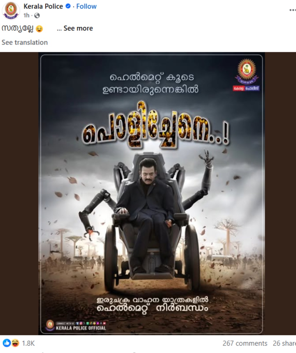 'ഹെൽമെന്റ് കൂടെ ഉണ്ടായിരുന്നെങ്കിൽ പൊളിച്ചേനെ' എന്നാണ് കേരള പൊലീസ് ട്രോളിയിരിക്കുന്നത്. ഇരു ചക്ര വാഹനങ്ങൾ ഓടിക്കുമ്പോൾ ഹെൽമെന്റ് നിർബന്ധമെന്നും കേരള പൊലീസ് പോസ്റ്ററിൽ പറയുന്നുണ്ട്. 'സത്യമല്ലേ' എന്നാണ് പോസ്റ്ററിന് കേരള പൊലീസ് ക്യാപ്ഷൻ നൽകിയിരുന്നത്. ട്രെൻഡിനൊപ്പം സഞ്ചരിക്കുന്ന പതിവ് നേരത്തെയും കേരള പൊലീസ് പിന്തുടർന്നിട്ടുണ്ട്.
