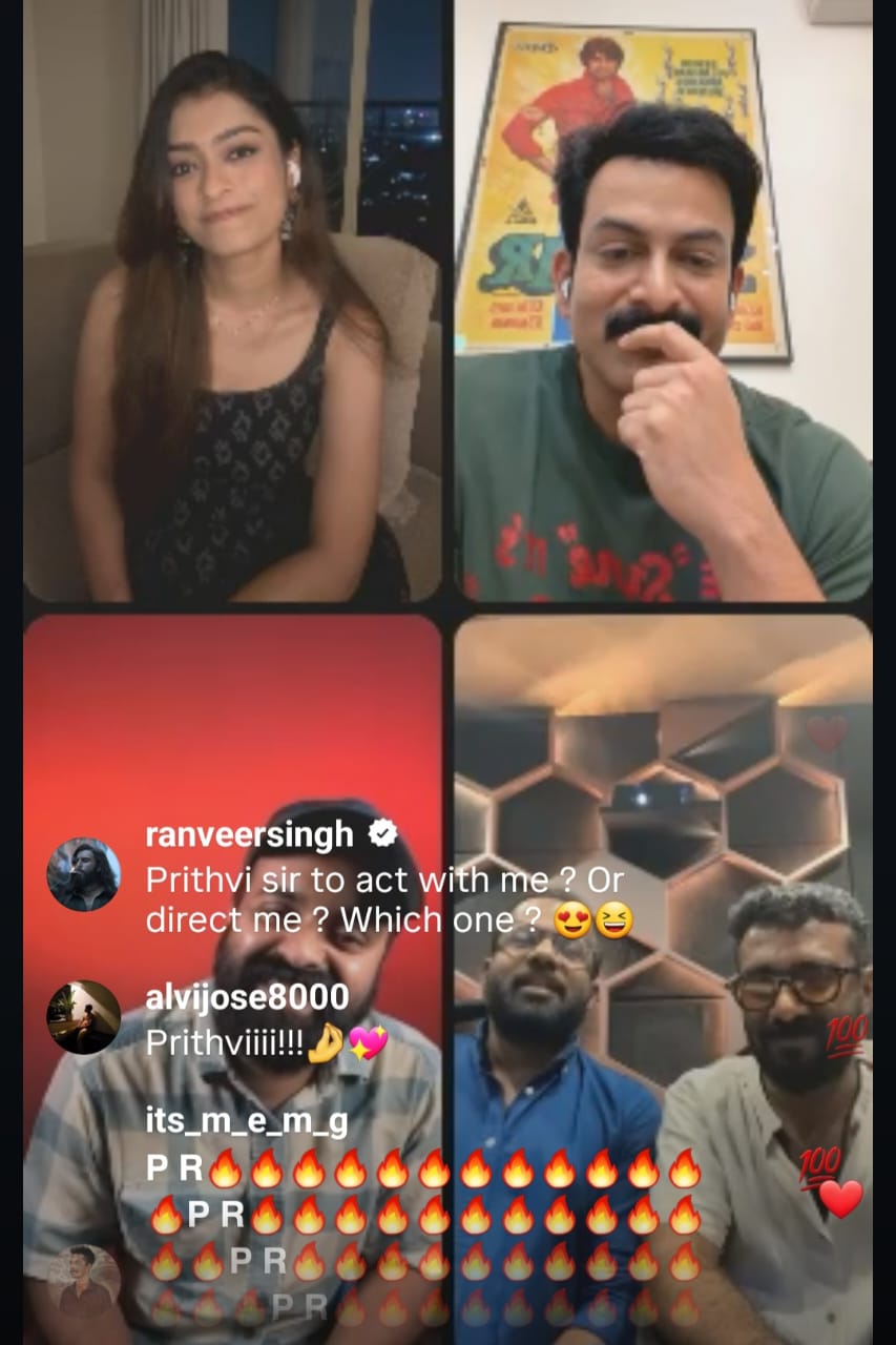 ഇൻസ്റ്റഗ്രാം ലൈവ് നടക്കുന്നതിനിടെയാണ് രൺവീർ സിംഗ് കമന്റുമായി എത്തിയത്. 'പൃഥ്വിരാജ് സാർ എനിക്കൊപ്പം അഭിനയിക്കാൻ ആണോ അതോ സംവിധാനം ചെയ്യാൻ ആണോ പോകുന്നത്? എന്നായിരുന്നു രൺവീറിന്റെ കമന്റ്. പൃഥ്വിരാജ് ഇരിക്കുന്നതിന് പിന്നിലായി ഒരു അമിതാഭ് ബച്ചൻ സിനിമയുടെ പോസ്റ്ററും കാണാം. അതിനെ പുകഴ്ത്തിയും രൺവീർ എത്തി. 'പൃഥ്വി സാർ, താങ്കളുടെ പിന്നിലുള്ള പോസ്റ്റർ എനിക്ക് വളരെയധികം ഇഷ്ടമായി' എന്നാണ് നടൻ കുറിച്ചത്. എന്തായാലും രൺവീറിന്റെ അപ്രതീക്ഷിതമായ എൻട്രി പ്രേക്ഷകരെ എല്ലാവരെയും ഞെട്ടിച്ചിരിക്കുകയാണ്. പൃഥ്വിരാജിന്റെ പാൻ ഇന്ത്യൻ റീച്ചിനെയാണ് ഇത് സൂചിപ്പിക്കുന്നത് എന്നാണ് പലരും സോഷ്യൽ മീഡിയയിൽ കമന്റ് ചെയ്യുന്നത്.