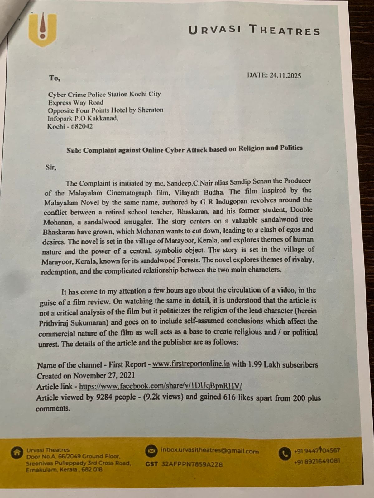 ശ്രദ്ധേയ എഴുത്തുകാരനായ ജി ആർ ഇന്ദുഗോപന്റെ പ്രശസ്തമായ നോവലിനെ ആസ്പദമാക്കി അതേപേരിൽ തന്നെ ഒരുക്കിയിരിക്കുന്ന ചിത്രമാണ് 'വിലായത്ത് ബുദ്ധ'. സിനിമയുടെ ഉള്ളടക്കത്തെ വളച്ചൊടിച്ച് മതങ്ങളെയും രാഷ്ട്രീയ ചിന്താഗതികളെയും അവഹേളിക്കുന്ന തരത്തിലാണ് ചാനൽ വീഡിയോ പ്രചരിപ്പിച്ചിരിക്കുന്നത്. ഇത് സൈബർ ടെററിസമാണെന്നും ഇതിലൂടെ സമൂഹത്തിൽ വർഗീയ ധ്രുവീകരണം സൃഷ്ടിക്കാനും സിനിമയുടെ പേരിനെ തന്നെ കളങ്കപ്പെടുത്താനും യൂട്യൂബ് ചാനൽ ശ്രമിച്ചു എന്ന് അദ്ദേഹം പരാതിയിൽ ചൂണ്ടിക്കാട്ടിയിരിക്കുകയാണ്.