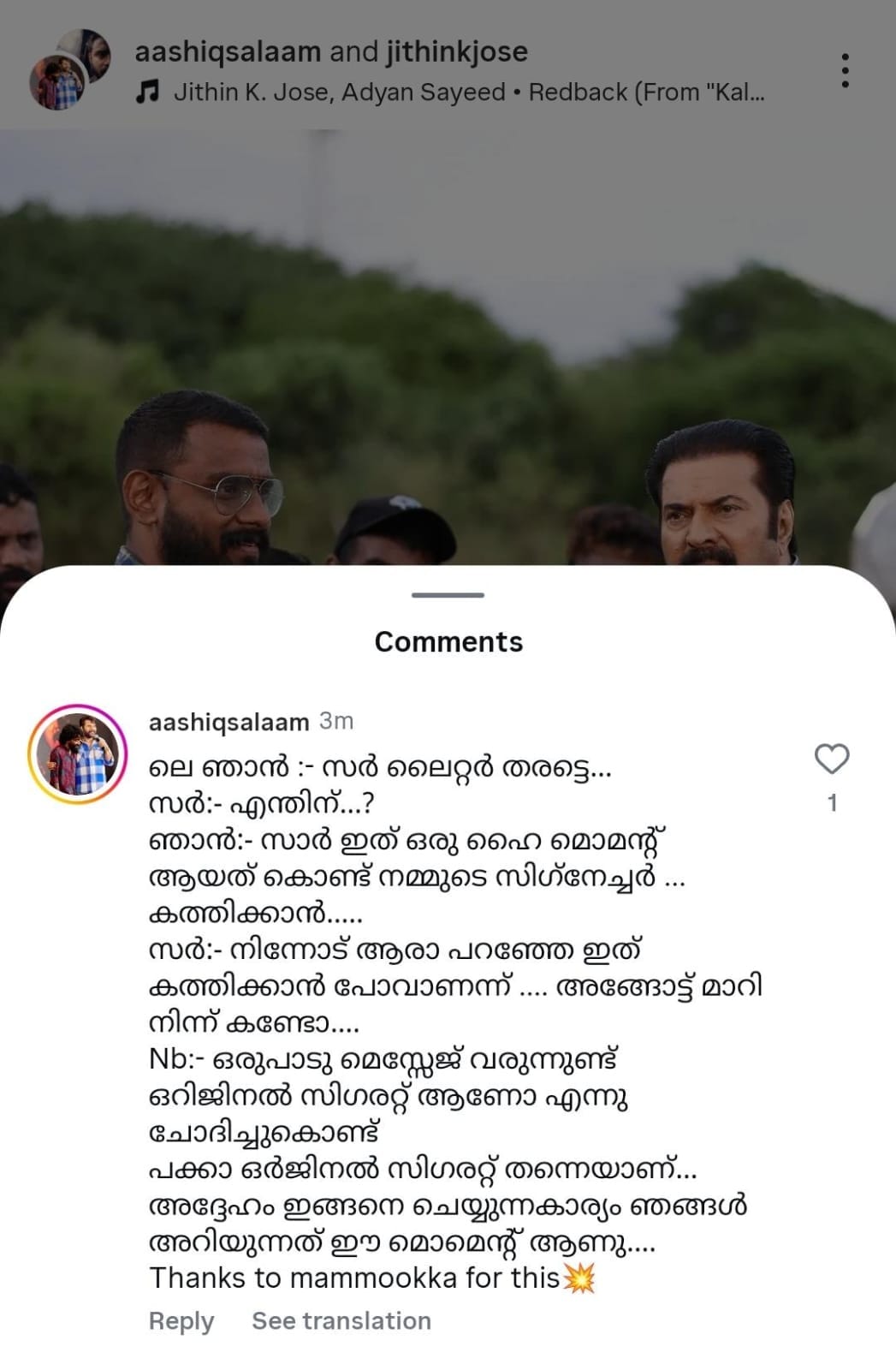 മമ്മൂട്ടിയും വിനായകനും കേന്ദ്ര കഥാപാത്രങ്ങളായി എത്തിയ കളങ്കാവല് മികച്ച പ്രതികരണം നേടി മുന്നേറുകയാണ്. ജിതിന് കെ ജോസ് സംവിധാനം ചെയ്ത ചിത്രം ആദ്യ ഷോയ്ക്ക് ശേഷം തന്നെ മികച്ച പ്രതികരണമാണ് നേടിയത്. ബോക്സ് ഓഫീസിലും വമ്പൻ നേട്ടമാണ് ഈ മമ്മൂട്ടി ചിത്രം നേടുന്നത്. ചിത്രത്തിൽ മമ്മൂട്ടി സിഗരറ്റ് ചവച്ച് തുപ്പുന്ന സീൻ മമ്മൂട്ടി കയ്യിൽ നിന്ന് ഇട്ടതാണെന്നും സീൻ ഷൂട്ട് ചെയ്തു കഴിഞ്ഞു എല്ലാവരും അത്ഭുതപ്പെട്ടെന്നും റിപ്പോർട്ടറിന് നൽകിയ അഭിമുഖത്തിൽ സംവിധായകൻ ജിതിൻ വെളിപ്പെടുത്തിയിരുന്നു. ഇപ്പോഴിതാ ഈ സീനിന് പിന്നിലെ മറ്റൊരു സർപ്രൈസ് കൂടി പുറത്തുവിട്ടിരിക്കുകയാണ് സിനിമയുടെ അസോസിയേറ്റ് ഡയറക്ടർ ആയ ആഷിക് സലാം.