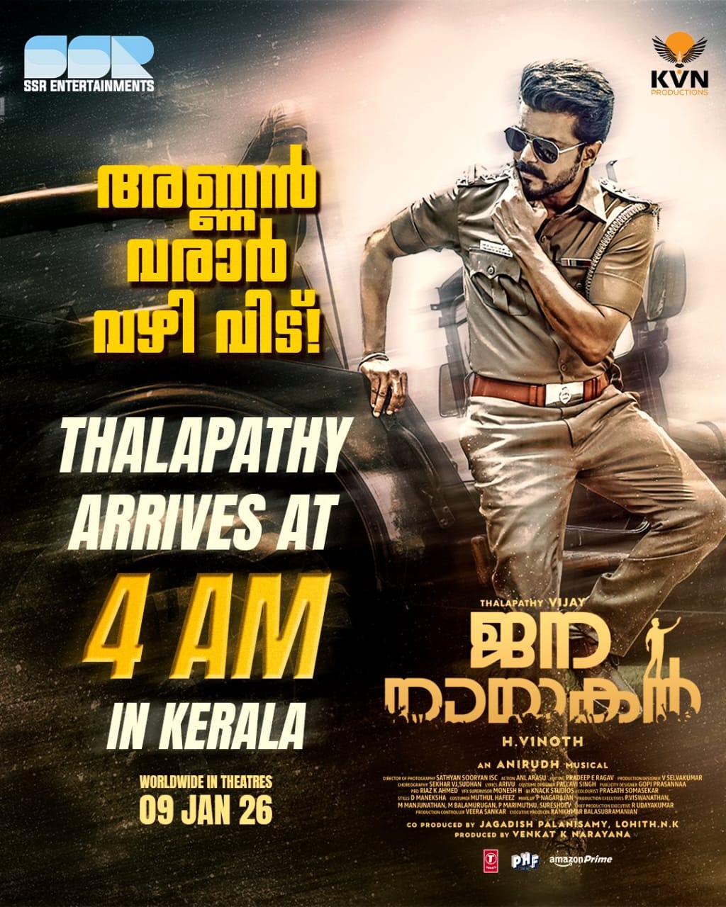 സാധാരണ വിജയ് സിനിമകൾക്ക് ഇങ്ങ് കേരളത്തിൽ വരെ വലിയ ഓളമാണ് ഉണ്ടാകാറുള്ളത്. ഇക്കുറി ആഘോഷം അല്പം കൂടെ കൂടും. സിനിമ കേരളത്തിൽ പ്രദർശനം ആരംഭിക്കുന്നത് പുലർച്ചെ നാലു മണിക്കാണ്. പോലീസ് വേഷത്തിലാണ് വിജയ് ചിത്രത്തിൽ എത്തുന്നത്. ചിത്രത്തിന്റെ ഓഡിയോ ലോഞ്ച് ഡിസംബര് 28 ന് മലേഷ്യയിലെ ക്വാലാലംപൂരില് വെച്ച് നടക്കും. പരിപാടിക്ക് മുന്നോടിയായി മലേഷ്യന് സര്ക്കാര് നല്കിയ നിര്ദേശങ്ങൾ ശ്രദ്ധ നേടിയിരുന്നു. പരിപാടി സിനിമയുടെ പ്രമോഷൻ മാത്രമായിരിക്കണമെന്നും ചടങ്ങില് സംസാരിക്കുന്നവര് ആരും തന്നെ രാഷ്ട്രീയപരമായ കാര്യങ്ങള് സംസാരിക്കുന്നതെന്നും നിര്ദേശമുണ്ട്. വിജയിയുടെ രാഷ്ട്രീയ പാര്ട്ടിയായ തമിഴ് വെട്രി കഴകത്തിന്റെ ഫ്ളാഗുകളോ ചിഹ്നമോ ടി ഷര്ട്ടുകളോ ധരിച്ച് പരിപാടിക്കെത്തരുതെന്ന് പറഞ്ഞതായാണ് വിവരം.
