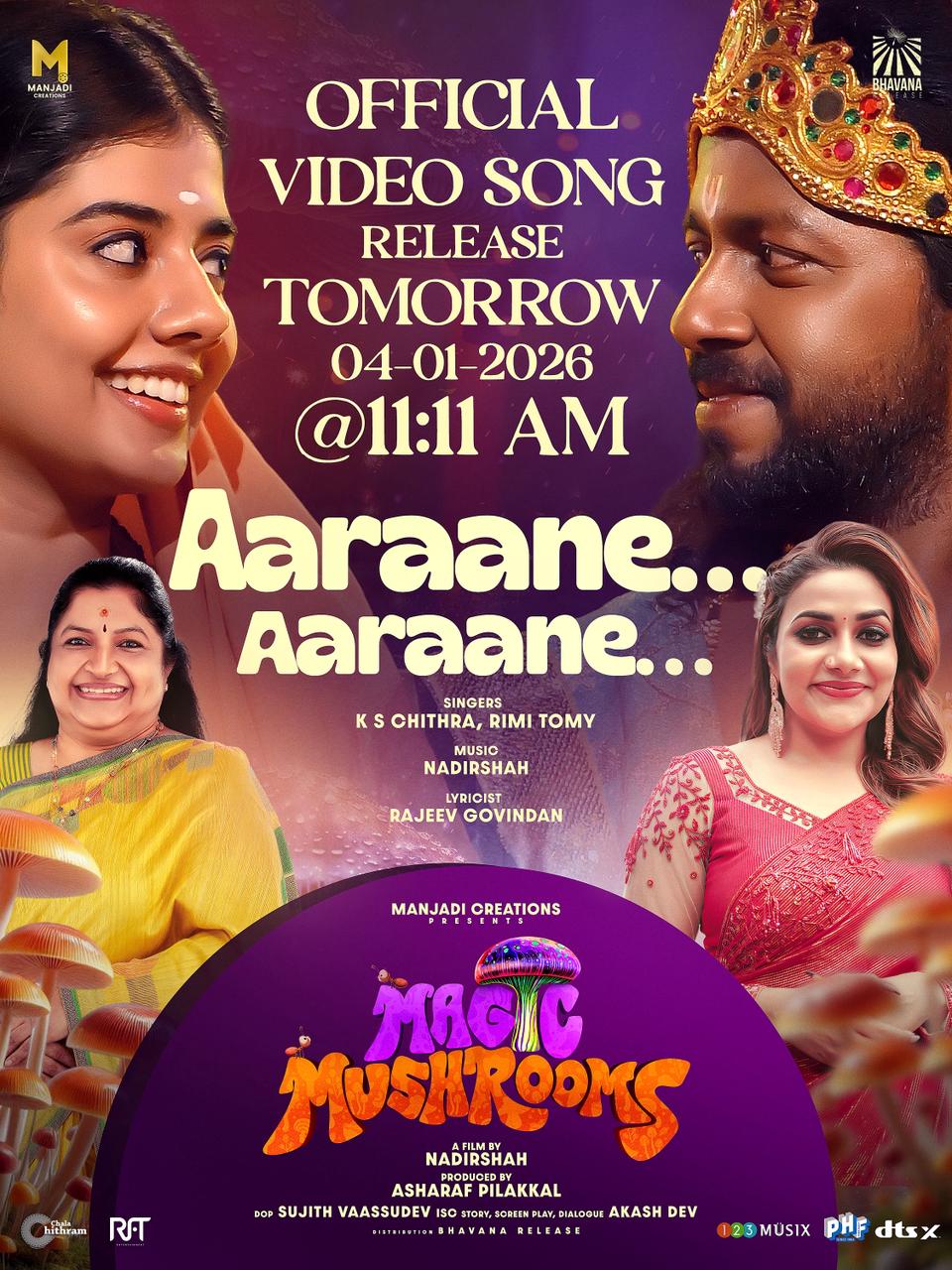 പ്രേക്ഷകർ ഏറ്റെടുത്ത 'കട്ടപ്പനയിലെ ഋത്വിക് റോഷന് ' ശേഷം വിഷ്ണു ഉണ്ണികൃഷ്ണനെ നായകനാക്കി നാദിർഷ സംവിധാനം ചെയ്യുന്ന ‘മാജിക് മഷ്റൂംസി'ൽ താനും കെ.എസ് ചിത്രയും ഒരുമിച്ച് പാടുന്ന ഗാനം പുറത്തിറങ്ങാൻ ഒരുങ്ങുന്നതിന്റെ സന്തോഷം പങ്കുവെച്ച് ഗായിക റിമി ടോമി. മലയാളത്തിന്റെ വാനമ്പാടി കെഎസ് ചിത്രയും റിമി ടോമിയും ആദ്യമായി ഒന്നുചേർന്ന് പാടിയിരിക്കുന്ന 'ആരാണേ ആരാണേ…' എന്ന് തുടങ്ങുന്ന ഗാനം നാളെ രാവിലെ 11.11നാണ് പുറത്തിറങ്ങുന്നത്. രസകരമായൊരു ഫൺ ഫാമിലി ഫീൽ ഗുഡ് എൻ്റർടെയ്നറായി എത്തുന്ന ‘മാജിക് മഷ്റൂംസ്' ജനുവരി 23-ന് തിയേറ്ററുകളിൽ എത്തും.