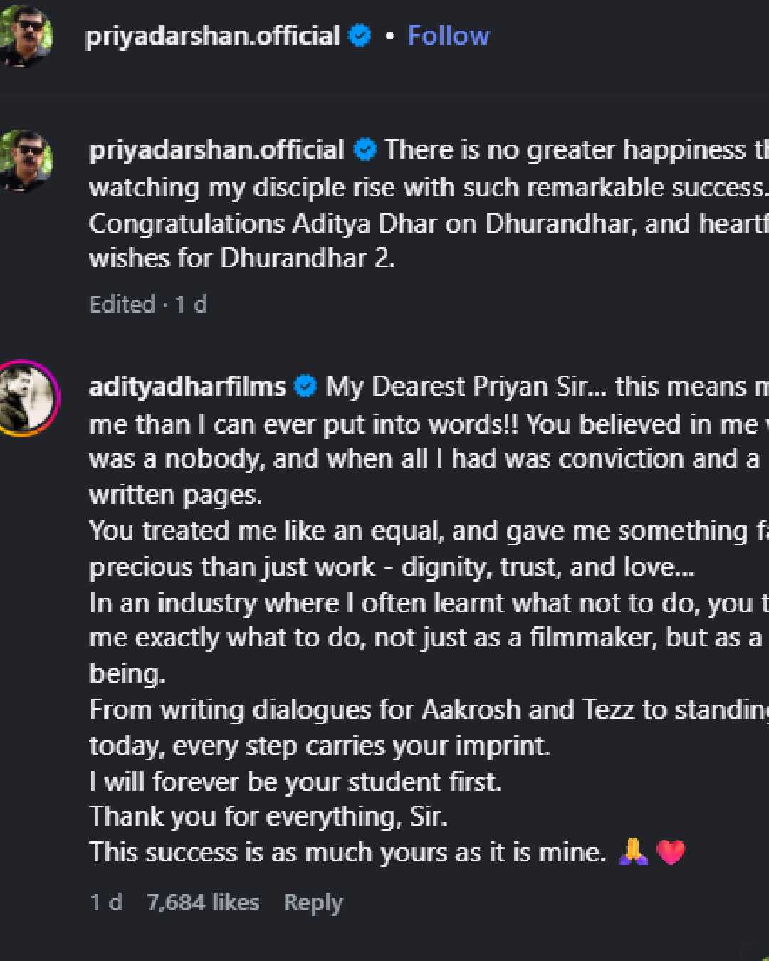 ഇപ്പോൾ ഗുരുവിന്റെ വാക്കുകൾക്ക് നന്ദി അറിയിച്ചുകൊണ്ട് ആദിത്യ ധറും എത്തിയിരിക്കുകയാണ്. പ്രിയദർശന്റെ ഇൻസ്റ്റഗ്രാം പോസ്റ്റിൽ കമന്റുമായാണ് ആദിത്യ എത്തിയത്. തന്റെ ഇന്ന കാണുന്ന ഈ വിജയം പ്രിയദർശന് കൂടി അവകാശപ്പെട്ടതാണെന്നാണ് അദ്ദേഹം പറയുന്നത്. സിനിമയിലും ജീവിതത്തിലും എങ്ങനെ മുന്നേറണമെന്നതിന്റെ പാഠങ്ങൾ പകർന്ന് നൽകിയത് പ്രിയദർശൻ ആണെന്നും ആദിത്യ പറഞ്ഞു.