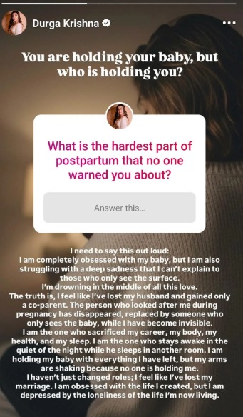 എന്റെ ശേഷിക്കുന്ന കരുത്ത് ഉപയോഗിച്ച് ഞാൻ കുഞ്ഞിനെ പിടിച്ചിരിക്കുകയാണ്, പക്ഷേ എന്നെ താങ്ങാൻ ആരുമില്ലാത്തതിനാൽ എന്റെ കൈകൾ വിറയ്ക്കുന്നു. എനിക്ക് എന്റെ വിവാഹജീവിതം തന്നെ നഷ്ടപ്പെട്ടതായി തോന്നുന്നു. ഞാൻ സൃഷ്ടിച്ച ഈ ജീവനോട് എനിക്ക് വല്ലാത്ത ഇഷ്ടമാണ്, പക്ഷേ ഇപ്പോൾ ഞാൻ ജീവിക്കുന്ന ഈ ഏകാന്തത എന്നെ വിഷാദത്തിലാക്കുന്നു,' ദുർഗ കൃഷ്ണ പറഞ്ഞു. റെഡിറ്റിലും മറ്റ് സോഷ്യൽ മീഡിയ പ്ലാറ്റ്ഫോമുകളിലും ദുർഗയുടെ ഈ കുറിപ്പ് ശ്രദ്ധ നേടുന്നുണ്ട്. നടിയുടെ ഈ തുറന്ന് പറച്ചിലിന് വലിയ കയ്യടിയാണ് ലഭിക്കുന്നത്.