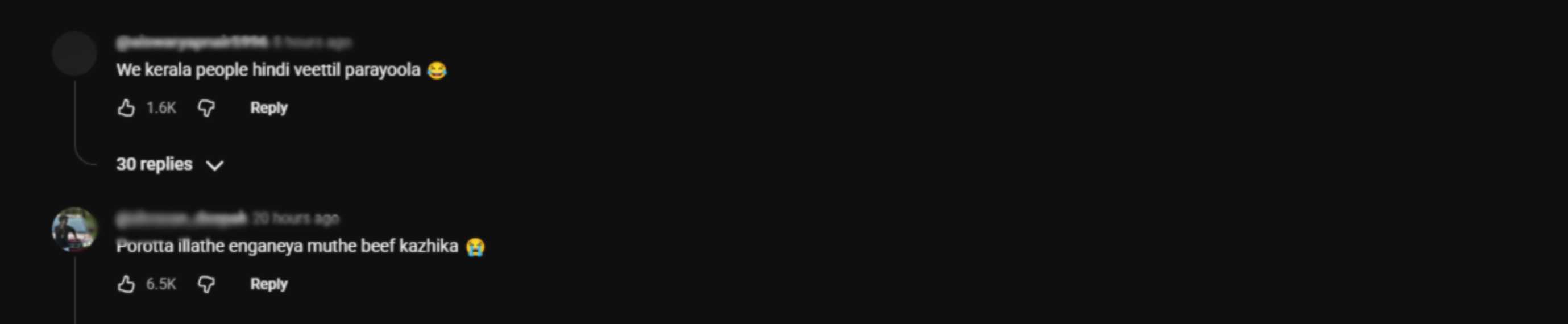 ചിത്രത്തില് കേരളത്തില് നിന്നുമുള്ള ഹിന്ദു പെണ്കുട്ടിയെ നിര്ബന്ധിച്ച് ബീഫ് കഴിപ്പിക്കുന്ന രംഗത്തിനാണ് ഏറ്റവുമധികം ട്രോളുയരുന്നത്. 'ബീഫ് കഴിക്കുന്നതിനേക്കാൾ ഞാൻ പട്ടിണി കിടന്നു മരിക്കും' എന്നാണ് സീനിൽ കഥാപാത്രം പറയുന്നത്. പിന്നാലെ ഇതിനെ ട്രോളികൊണ്ട് നിരവധി മലയാളി കമന്റുകളാണ് നിറയുന്നത്. ബീഫ് കഴിക്കുന്ന രംഗത്തിന് ഇനി ആളെ ആവശ്യമുണ്ടെങ്കില് പറയണമെന്നും നിര്ബന്ധിക്കാതെ തന്നെ കഴിക്കാമെന്നുമാണ് ചിലര് പറയുന്നത്. ബീഫിനൊക്കെ എന്തൊരു വിലയാണെന്നും ഇങ്ങനെ തുപ്പിക്കളയാമോ എന്നും ചിലര് ചോദിക്കുന്നു. ഇനി പൊറോട്ട ഇല്ലാത്തതുകൊണ്ടാണോ കുട്ടി ബീഫ് കഴിക്കാത്തതെന്നും സംശയം പ്രകടിപ്പിച്ചവരുണ്ട്. 'ബീഫ് മാത്രം കൊടുത്താൽ കഴിക്കുന്നത് എങ്ങനെ? 2 നല്ല ചൂടുള്ള പൊറോട്ട കൂടി കൊടുക്ക്. ചാപ്സ് ന്റെ ഗ്രേവി കൂടി ഉണ്ടെങ്കിൽ ഉഷാർ', 'ഒരു പൊറോട്ട എങ്കിലും കൊടുക്കാർന്നു' എന്നിങ്ങനെയാണ് മറ്റു കമന്റുകൾ.