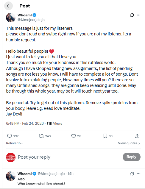 'ഈ സന്ദേശം എന്റെ ശ്രോതാക്കൾക്ക് വേണ്ടിയുള്ളതാണ്. എന്റെ ശ്രോതാവല്ലെങ്കിൽ ദയവ് ചെയ്ത് വായിക്കരുത് സ്വൈപ്പ് ചെയ്ത് പോവണം. ഇതൊരു അപേക്ഷയാണ്. ഹലോ പ്രിയപ്പെട്ടവരേ! എനിക്ക് നിങ്ങളെല്ലാവരെയും വലിയ ഇഷ്ടമാണെന്ന് പറയാൻ ഞാൻ ആഗ്രഹിക്കുന്നു. ഈ ക്രൂരമായ ലോകത്ത് നിങ്ങൾ കാണിക്കുന്ന ദയയ്ക്ക് ഒത്തിരി നന്ദി.