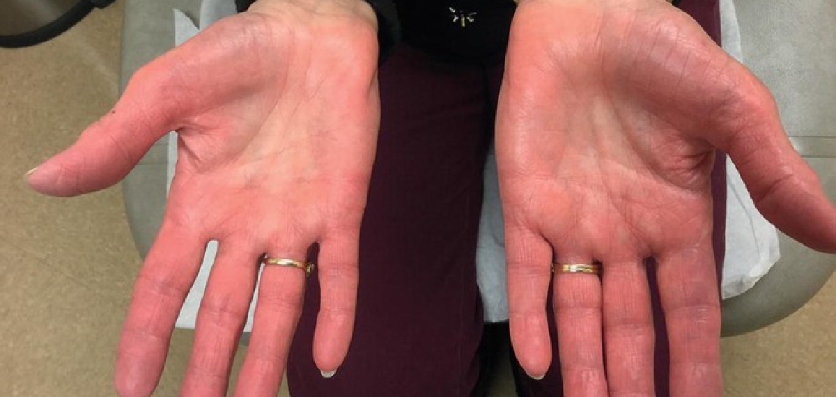 കൈപ്പത്തിയില് പ്രത്യേകിച്ച് തളളവിരലിനും ചെറുവിരലിനും താഴെയായി ചുവപ്പ് നിറത്തിലാണ് palmar erythema കാണപ്പെടുന്നത്. ഇത് കരള് പ്രവര്ത്തന തകരാറിനെ കാണിക്കുന്നു. ഈസ്ട്രജന് ഹോര്മോണിന്റെ ഉയര്ന്ന അളവ് ഇതിന്റെ കാരണമാണ്. ചില കേസുകളില് ഈ ലക്ഷണം ഹോര്മോണ് മാറ്റങ്ങള്, ഓട്ടോഇമ്യൂണ് രോഗങ്ങള്, റുമറ്റോയിഡ് ആര്ത്തറൈറ്റിസ് എന്നിവയുമായും ബന്ധപ്പെട്ടിരിക്കുന്നു.