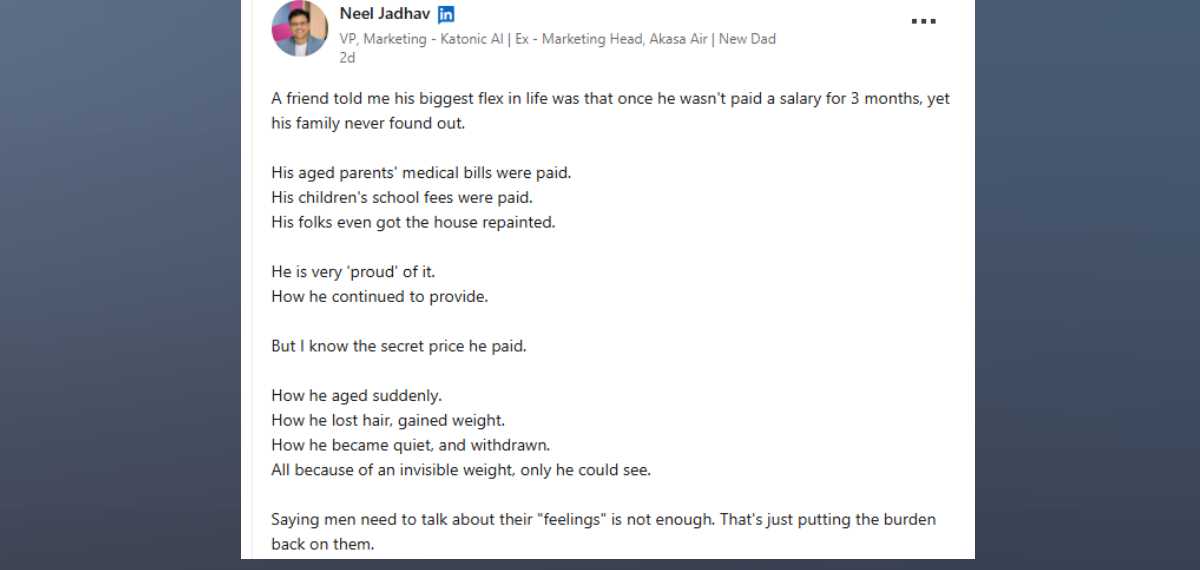 മൂന്ന് മാസം ശമ്പളമില്ലാതെ ജോലി ചെയ്ത തന്റെ സുഹൃത്തിനെ കുറിച്ചാണ് നീല് ജാദവ് എന്ന വ്യക്തി ലിങ്ക്ട് ഇന്നില് പോസ്റ്റ് ഷെയര് ചെയ്തിരിക്കുന്നത്. കുടുംബം പരിപാലിക്കാന് പുരുഷന്മാര് നേരിടുന്ന പ്രതിസന്ധികളെ കുറിച്ചുള്ള ഒരു ചര്ച്ചയ്ക്ക് സോഷ്യല് മീഡിയയില് ഇത് തുടക്കം കുറിക്കുകയും ചെയ്തു. മൂന്നുമാസം കഠിനമായ സാമ്പത്തിക ബുദ്ധിമുട്ട് അനുഭവിച്ചിട്ടും തന്റെ കുടുംബത്തെ അത് അറിയിക്കാതെ നല്ല രീതിയില് അയാള് കുടുംബം പരിപാലിച്ചുവെന്നാണ് പോസ്റ്റില് പറയുന്നത്.
