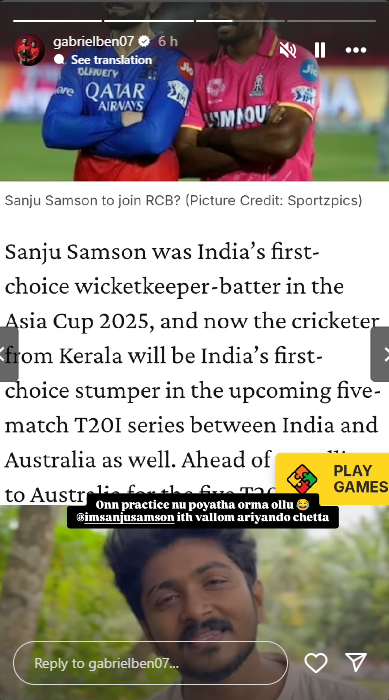 എന്നാൽ സഞ്ജുവിന്റെ ഏറ്റവും പുതിയ ഇൻസ്റ്റഗ്രാം സ്റ്റോറിക്ക് ശേഷം താരം റോയൽ ചാലഞ്ചേഴസ് ബെംഗളൂരുവിലേക്കാണെന്നും ഒരുപാട് റിപ്പോർട്ടുകൾ വന്നു. ഓസ്ട്രേലിയൻ പര്യടനത്തിന് മുന്നോടിയായി റോയൽ ചലഞ്ചേഴ്സ് ബെംഗളൂരുവിന്റെ ത്രോ ഡൗൺ സ്പെഷ്യലിസ്റ്റിനൊപ്പം നിൽക്കുന്ന ചിത്രമാണ് സഞ്ജു ഇൻസ്റ്റഗ്രാം സ്റ്റോറിയിൽ പങ്കുവെച്ചത്. ആർസിബിയുടെ ത്രോ ഡൗൺ സ്പെഷ്യലിസ്റ്റും മലയാളിയുമായ ഗബ്രിയേൽ കുര്യനൊപ്പം ടർഫിലാണ് സഞ്ജു നിൽക്കുന്നത്.