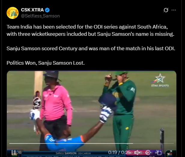 തുടർച്ചയായി സഞ്ജുവിനെ തഴയുന്ന ഇന്ത്യൻ ടീം മാനേജ്മെന്റിനെതിരെ ശക്തമായ വിമർശനമാണ് ആരാധകർ ഉയർത്തുന്നത്. 'ടീമില്‍ മൂന്ന് വിക്കറ്റ് കീപ്പര്‍ ബാറ്റര്‍മാരെ ഉള്‍പ്പെടുത്തിയിട്ടുണ്ട്. പക്ഷേ സഞ്ജു സാംസണിന്റെ പേര് കാണുന്നില്ല, സഞ്ജു അവസാന ഏകദിനത്തില്‍ സെഞ്ച്വറി നേടുകയും മാന്‍ ഓഫ് ദ മാച്ചായി തിരഞ്ഞെടുക്കപ്പെടുകയും ചെയ്തു. രാഷ്ട്രീയം ജയിച്ചു, സഞ്ജു സാംസണ്‍ തോറ്റു', എന്നാണ് ഒരു പോസ്റ്റ്. ഏകദിനത്തില്‍ റിഷഭ് പന്തിന് മോശം റെക്കോര്‍ഡാണുള്ളതെന്ന് എല്ലാവര്‍ക്കുമറിയാം എന്നിട്ടും ബിസിസിഐ എപ്പോഴും സഞ്ജുവിനേക്കാള്‍ പന്തിനെയാണ് പിന്തുണയ്ക്കുന്നത്. ഇന്ത്യന്‍ സെലക്ഷന്‍ പ്രക്രിയയിലുള്ള എല്ലാ വിശ്വാസവും നഷ്ടപ്പെടുന്നുവെന്നും പോസ്റ്റുകളുണ്ട്.