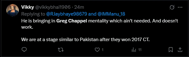 ആവശ്യമില്ലാതെ ഗ്രെഗ് ചാപ്പലിന്റെ മനോഭാവമാണ് ഗംഭീര് കൊണ്ടുവരുന്നതെന്നും അതൊരിക്കലും പ്രാവര്ത്തികമാവില്ലെന്നുമാണ് ഒരുപോസ്റ്റ്. ഓള്റൗണ്ടര്മാരെയും ഐപിഎല് ഹീറോസിനെയുമാണ് ഗംഭീര് പിന്തുണയ്ക്കുന്നതെന്നും ഇത് ഗ്രെഗ് ചാപ്പല് കോച്ചായിരുന്ന കാലഘട്ടത്തെ ഓര്മ്മിപ്പിക്കുന്നെന്നും മറ്റൊരു പോസ്റ്റുണ്ട്. ഇന്ത്യന് ടെസ്റ്റ് ടീമിനെ ഗംഭീര് നശിപ്പിച്ചുകളഞ്ഞെന്നും ഗ്രെഗ് ചാപ്പല് യുഗത്തേക്കാളും മോശം തകര്ച്ചയായിരിക്കും ഇന്ത്യന് ക്രിക്കറ്റ് നേരിടേണ്ടിവരികയെന്നുമാണ് ആരാധകരില് ചിലര് പറയുന്നത്. ഈ പരമ്പരയ്ക്ക് ശേഷം ഗംഭീര് പരിശീലകസ്ഥാനം രാജിവെക്കുമെന്നാണ് പ്രതീക്ഷിക്കുന്നതെന്നും പോസ്റ്റിലുണ്ട്.