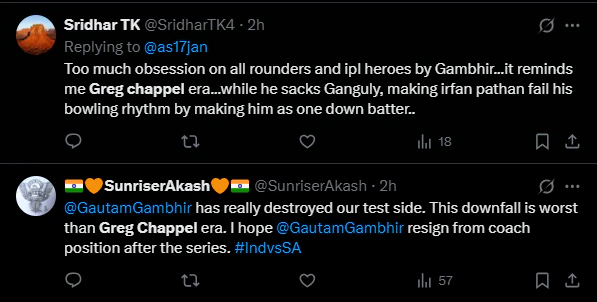 ഇന്ത്യയുടെ മുന് വിവാദ കോച്ചായ ഗ്രെഗ് ചാപ്പലിനോടാണ് സോഷ്യല് മീഡിയയിലെ ചില ആരാധകര് ഗൗതം ഗംഭീറിനെ ഉപമിക്കുന്നത്. 'ഗ്രെഗ് ചാപ്പലിന്റെ പുതിയ പതിപ്പാണ് ഗൗതം ഗംഭീര്. ഇന്ത്യന് ക്രിക്കറ്റിന്റെ കറുത്ത കാലഘട്ടമെന്നായിരുന്നു ചാപ്പലിന്റെ കാലത്തെ വിശേഷിപ്പിക്കുന്നത്. ഇപ്പോള് ഗംഭീറിന് കീഴില് ടീം വീണ്ടും തകര്ച്ചയിലേക്കു കൂപ്പുകുത്തിയിരിക്കുകയാണ്. അദ്ദേഹത്തെ പുറത്താക്കാതെ ടെസ്റ്റില് ഇന്ത്യ രക്ഷപ്പെടില്ല'.