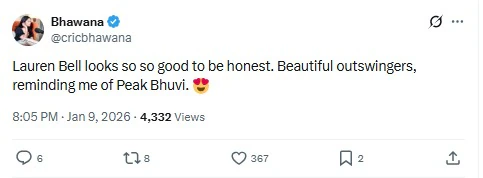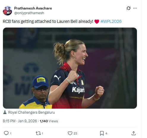 പുരുഷ ടീമിൽ ജോഷ് ഹെയ്സൽവുഡ് നൽകുന്ന ഇംപാക്ടാണ് ഇവിടടെ ബെൽ നടത്തുന്നതെന്ന് ആരാധകർ കമന്റ് ചെയ്യുന്നു. ടീമിലെ ലേഡി ഹെയ്സൽവുഡ് ആണ് അവരെന്നാണ് ആദ്യ മത്സരത്തിന് ശേഷം ആർസിബി ആരാധകരുടെ വാദം.