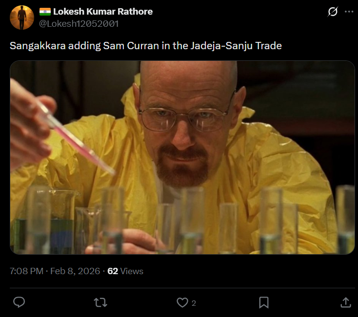 CSK traded in form Sam Curran for a finished player like Sanju Samson whom BCCI don't even trust 😭pic.twitter.com/iQjNxu6EiT
