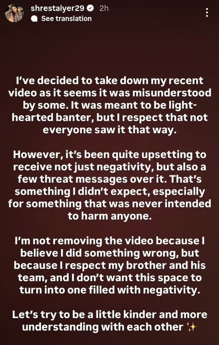 തെറ്റായി എന്തെങ്കിലും ചെയ്തു എന്നത് കൊണ്ടല്ല വീഡിയോ നീക്കം ചെയ്യുന്നതെന്നും തന്റെ സഹോദരനോടും ടീമിനോടുമുള്ള ബഹുമാനത്തിന്റെ ഭാഗമായാണെന്നും ആവശ്യമില്ലാത്ത നെഗറ്റീവിറ്റി ചുമക്കേണ്ടതില്ല എന്ന് കരുതിയാണെന്നും ശ്രേഷ്ഠ കൂട്ടിച്ചേര്ത്തു. ആരോഗ്യകരമല്ലാത്ത രീതിയില് ഇങ്ങനെ വ്യക്തികളെ സൈബര് അറ്റാക്ക് ചെയ്യുന്നത് നല്ലതല്ലെന്നും ശ്രേഷ്ഠ പറയുന്നു.