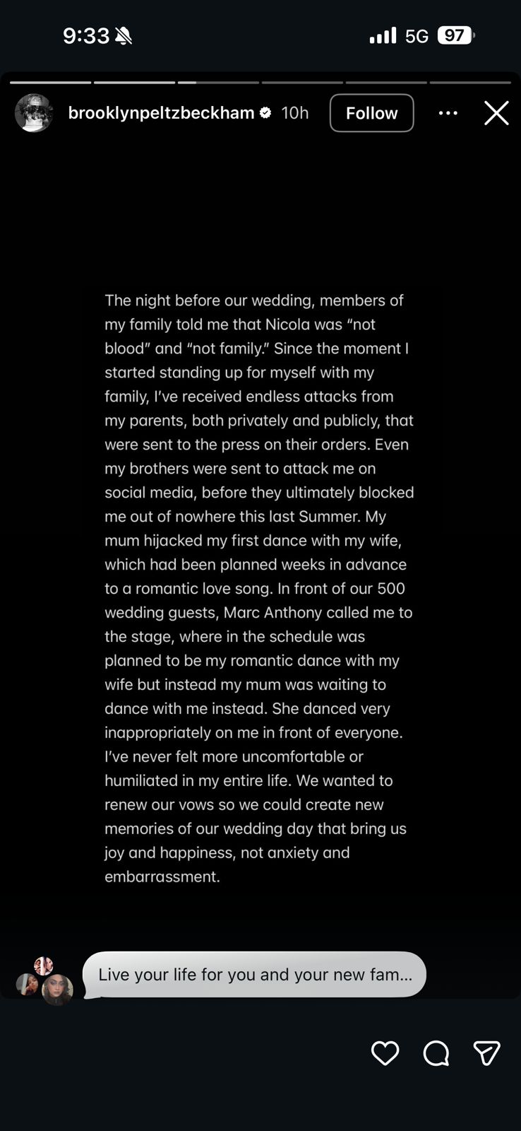 ജീവിതകാലം മുഴുവൻ, തന്റെ മാതാപിതാക്കൾ യഥാർഥ കുടുംബ ബന്ധങ്ങളേക്കാൾ പൊതുജന ബന്ധങ്ങൾക്കും വ്യാജ സ്നേഹ പ്രകടനങ്ങൾക്കുമാണ് മുൻഗണന നൽകിയതെന്ന് ബ്രൂക്‌ലിൻ ആരോപിച്ചു. തന്റെ വിവാഹം മുടക്കാൻ പിതാവായ ബെക്കാമും മാതാവായ വിക്ടോറിയയും നോക്കിയെന്നും മകൻ ആരോപിച്ചു.