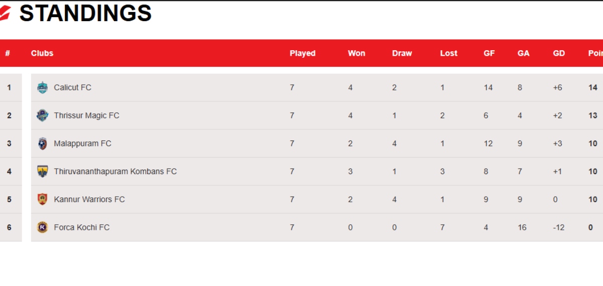നിലവിൽ പോയിന്റ് പട്ടികയിൽ ഒന്നാമതുള്ളത് നിലവിലെ ചാമ്പ്യന്മാരായ കാലിക്കറ്റ് എഫ്സിയാണ്. ഏഴ് മത്സരങ്ങളിൽ നിന്ന് നാല് ജയവും രണ്ട് സമനിലയും ഒരു തോൽവിയുമായി 14 പോയിന്റാണ് കാലിക്കറ്റിനുള്ളത്.