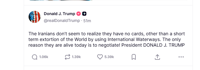 വാഷിംഗ്ടൺ: ഇറാനെതിരെ വീണ്ടും ഭീഷണി ഉയർത്തി അമേരിക്കൻ പ്രസിഡൻ്റ് ഡോണൾഡ് ട്രംപ്. ഇറാൻ്റെ കൈയിൽ ഇനി ഒന്നും ബാക്കിയില്ല. ചർച്ച ചെയ്യാമെന്ന ഉറപ്പ് നൽകിയത് കൊണ്ട് മാത്രമാണ് ഇറാൻ ഇന്നും നിലനിൽക്കുന്നതെന്നാണ് ട്രംപിൻ്റെ വാദം. ട്രൂത്ത് സോഷ്യലിലാണ് പ്രസിഡൻ്റ് ഡോണൾഡ് ട്രംപ് അവകാശവാദം ഉന്നയിച്ചത്. തന്ത്രപ്രധാനമായ ജലപാത കൈക്കലാക്കി കുറച്ച് കാലത്തേയ്ക്ക് ലോക രാജ്യങ്ങളെ കൊള്ളയടിക്കാനായിരുന്നു ഇറാൻ്റെ നീക്കം. ഇത് അല്ലാതെ ഇറാന് മറ്റൊന്നും ചെയ്യാനാകില്ലെന്നും ഇറാന് പ്രതിരോധിച്ച് നിൽകാൻ വേറൊന്നും ഇല്ലെന്നാണ് ട്രംപ് പറയുന്നത്.