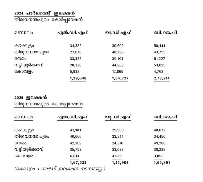 ലോക്സഭ 2024, തദ്ദേശ തിരഞ്ഞെടുപ്പ് 2025 (തിരുവനന്തപുരം കോര്പ്പറേഷന്)