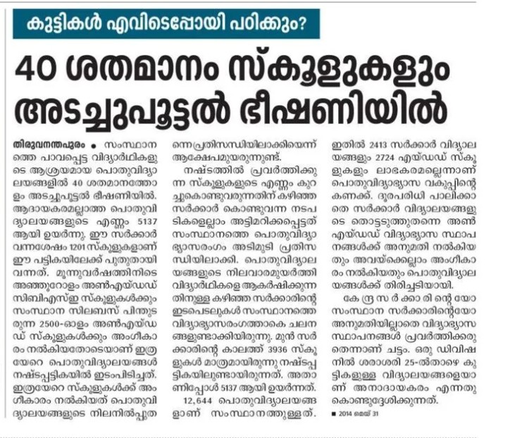 കൊച്ചി: ഇന്ന് രാവിലെ ദേശാഭിമാനി പത്രമെടുത്ത് വായിക്കുമ്പോള് ഒരു അമ്പരപ്പ് ഉണ്ടാകും. കാരണം ഒന്നാം പേജില് ദേശാഭിമാനി പോലെ ഒരു പത്രം നല്കുന്ന വാര്ത്തയേ അല്ല ഉള്ളത്. 'ഇന്ന് മുതല് ലോഡ് ഷെഡ്ഡിങ്, നാല്പത് ശതമാനം സ്കൂളുകളും അടച്ച് പൂട്ടല് ഭീഷണിയില്, പൂട്ടലിന്റെ വക്കില് കെഎസ്ആര്ടിസി, പെന്ഷനുകള് മുടങ്ങിയിട്ട് പതിനെട്ട് മാസം' എന്നിങ്ങനെയെല്ലാമാണ് ഒന്നാം പേജില് നല്കിയിരിക്കുന്നത്. എന്നാല് ഇത് യഥാര്ത്ഥത്തില് വാര്ത്തയല്ല. പിആര്ഡി നല്കിയിരിക്കുന്ന പരസ്യമാണ്. ദേശാഭിമാനിയില് മാത്രമല്ല, ദ ഹിന്ദു, മാധ്യമം തുടങ്ങിയ പത്രങ്ങളും ഇത് നല്കിയിട്ടുണ്ട്.