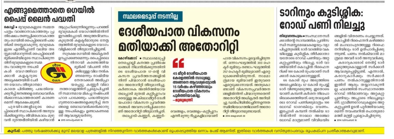 ഉമ്മന്ചാണ്ടി സര്ക്കാരിന്റെ കാലത്ത് കെഎസ്ആര്ടിയില് മാസം 124 കോടിയോളം രൂപയുടെ നഷ്ടമാണെങ്കില് പിണറായി സര്ക്കാരിന്റെ കാലത്ത് എല്ലാ ഡിപ്പോകളും ലാഭത്തിലാണെന്നാണ് പറയുന്നത്. യുഡിഫ് ഭരണകാലത്ത് 'പരീക്ഷയെഴുതിയത് പാഠപുസ്തകമില്ലാതെ'യാണെങ്കില് എല്ഡിഎഫ് ഭരണകാലത്ത് 'പാഠപുസ്തകങ്ങള് സ്കൂളുകള് തുറക്കും മുമ്പേ' ആണ്. മന്ത്രിമാരുടെ പ്രതികരണങ്ങളും താരതമ്യം ചെയ്ത് നല്കിയിട്ടുണ്ട്. 'കളറായതുകൊണ്ട് വൈകി' എന്നാണ് യുഡിഎഫ് മന്ത്രി പറയുന്നതെങ്കില് 'ഫോട്ടോ സ്റ്റാറ്റ് ഇനി വേണ്ട' എന്നാണ് എല്ഡിഎഫ് സര്ക്കാരിന്റെ മന്ത്രി പറഞ്ഞത്. 'എങ്ങുമെത്താതെ ഗെയില് പൈപ്പ് ലൈന് പദ്ധതി-വികസനത്തിന് ഇന്ധനമായി ഗെയ്ല്, സാമ്പത്തിക വര്ഷത്തിന്റെ അവസാനദിനം ട്രഷറി കാലി-ജീവനക്കാരുടെ ക്ഷേമം ഉറപ്പാക്കി സര്ക്കാര്, ടാറിനും കുടിശ്ശിക, റോഡ് പണി നിലച്ചു-റോഡുകള് ഹൈടെക്ക്, ശമ്പളം നല്കാന് എല്ഐസിയില് നിന്ന് കടമെടുക്കാന് സര്ക്കാര്-ശമ്പളവും ക്ഷേമവും മുടങ്ങാതെ കേരളം, മരുന്നില്ലാതെ ആശുപത്രികള്-ആരോഗ്യമേഖലയില് ഫെബ്രുവരിയില് 2,789 കോടിയുടെ പദ്ധതികള്' തുടങ്ങിയവയും നല്കിയിട്ടുണ്ട്.