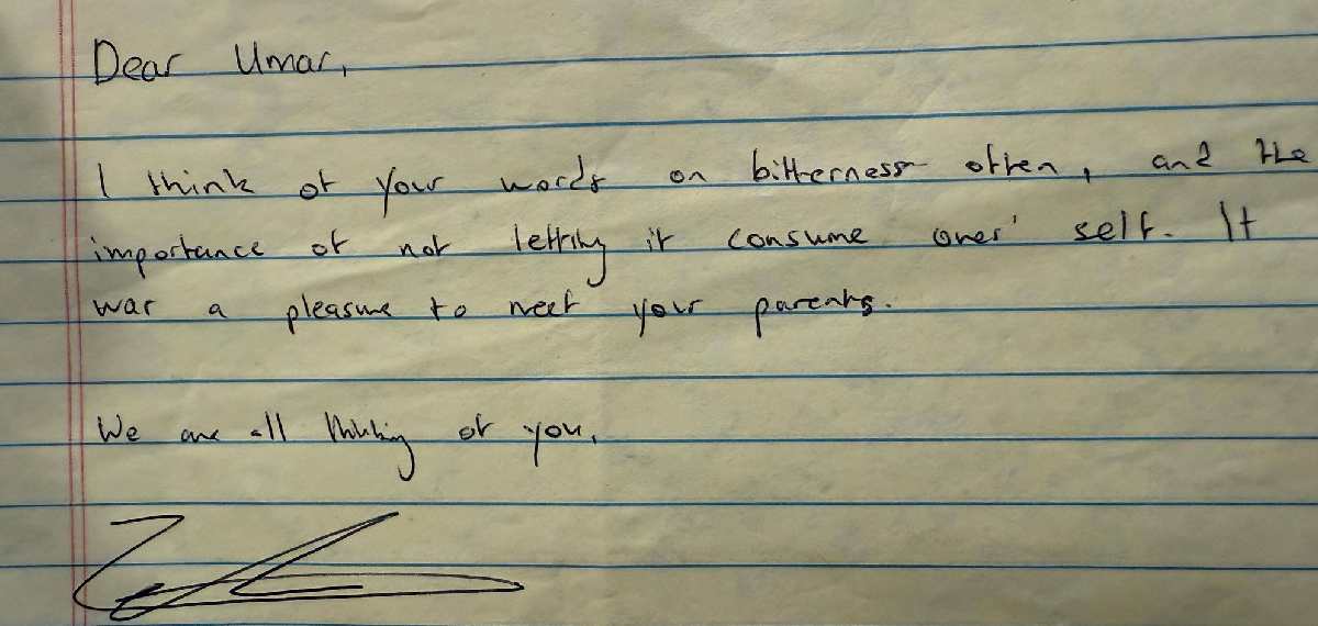 പ്രിയപ്പെട്ട ഉമര് എന്ന് പറഞ്ഞുകൊണ്ടാണ് കത്ത് തുടങ്ങുന്നത്. കയ്പിനെ കുറിച്ചും സ്വയം നശിക്കപ്പെടാതിരിക്കേണ്ടതിന്റെ പ്രാധാന്യത്തെക്കുറിച്ചുമുള്ള താങ്കളുടെ വാക്കുകള് താന് ഓര്ക്കാറുണ്ടെന്ന് മംദാനി കത്തില് പറയുന്നു. ഉമറിന്റെ മാതാപിതാക്കളെ കണ്ടുമുട്ടാന് കഴിഞ്ഞതില് സന്തോഷമുണ്ട്. തങ്ങളുടെ എല്ലാവരുടെയും ചിന്തയില് നീയുണ്ടെന്ന് പറഞ്ഞാണ് സൊഹ്റാന് മംദാനി കത്ത് അവസാനിപ്പിക്കുന്നത്. നേരത്തേ ന്യൂയോര്ക്ക് മേയറാകുന്നതിന് മുന്പ് ജനാധിപത്യത്തെ കുറിച്ചുള്ള ഒരു പരിപാടിയില് പങ്കെടുത്ത് പ്രസംഗിക്കുന്നതിനിടെ ഉമര് ഖാലിദിന്റെ കുറിപ്പുകള് മംദാനി വായിച്ചിരുന്നു. വിചാരണ പോലുമില്ലാതെ ഉമറിനെ തടവില് പാര്പ്പിച്ചിരിക്കുകയാണെന്നുള്ള കാര്യം ആമുഖത്തില് മംദാനി പറഞ്ഞിരുന്നു.
