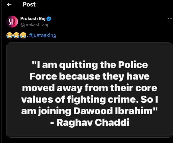 Content Highlights: 'Police force is not good, so I am Joining Dawood Ibrahim'; Prakash Raj trolls Raghav Chadha